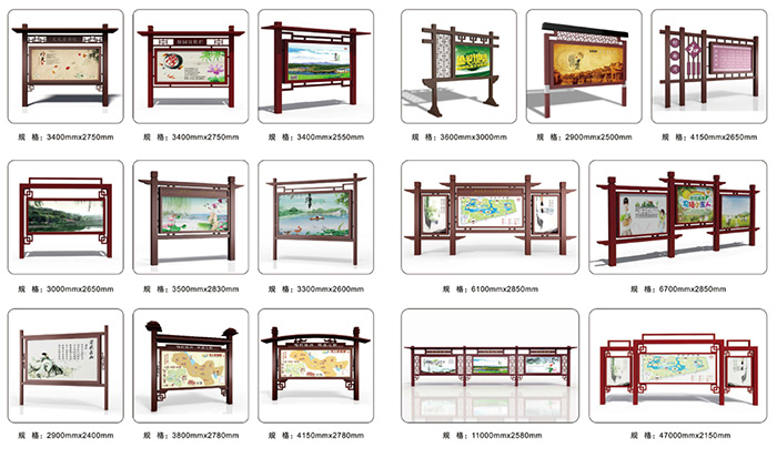 仿古宣傳欄設(shè)計(jì)制作相對(duì)于其他宣傳欄,具有主題突出的外觀特點(diǎn),其外觀設(shè)計(jì)更加具有古文化特色。其外觀設(shè)計(jì)不僅要有古文化特色,還要綜合考慮當(dāng)?shù)匚幕厣?/p>