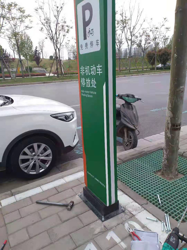 圖為停車標(biāo)識(shí)牌安裝現(xiàn)場: